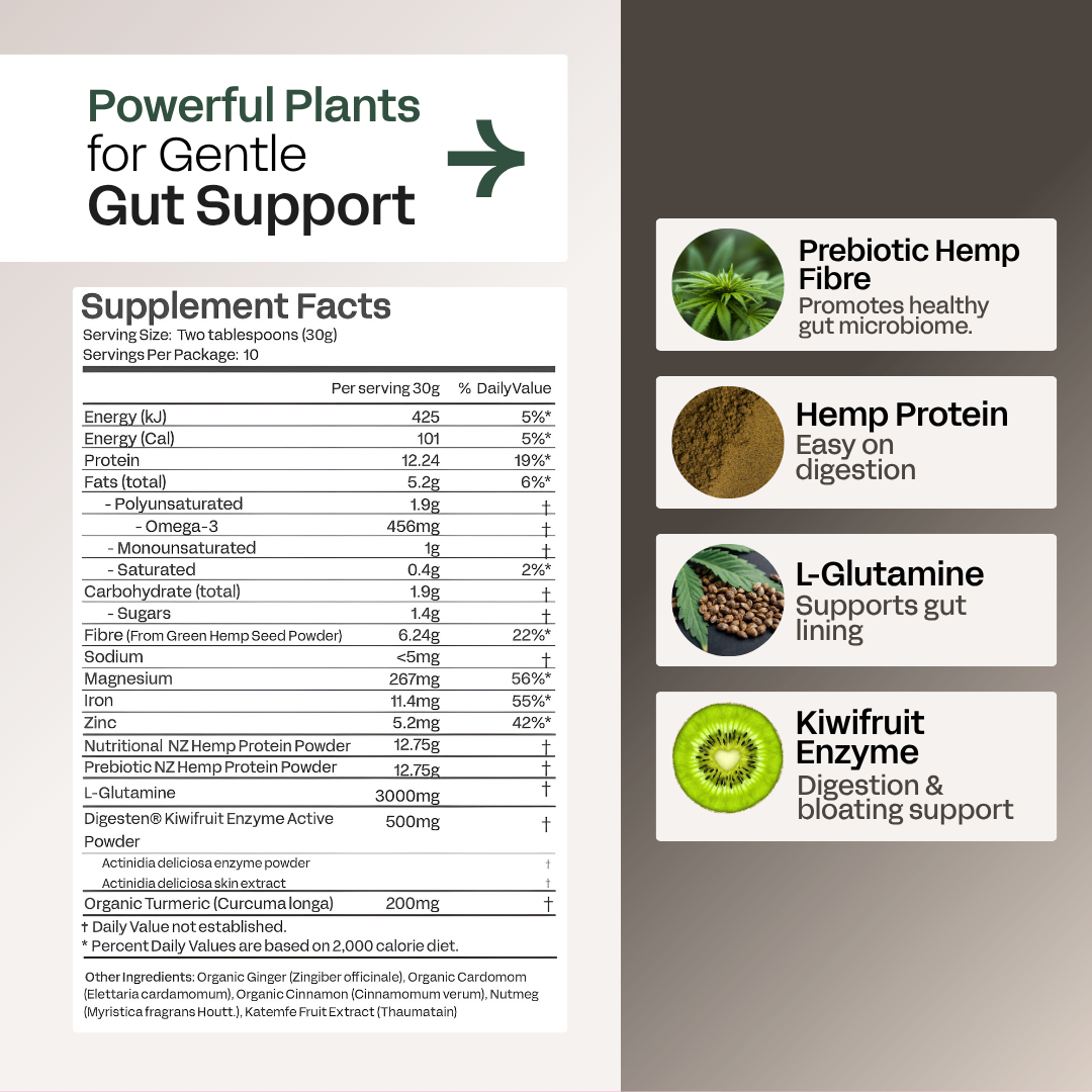 Ingredients: Each 30g contains 26.5g New Zealand & Australian Hemp Protein Powder, 500mg Digestin Kiwifruit Active Enzyme Powder, 3000mg L-Glutamine & Katemfe Fruit Extract (Thaumatin)
