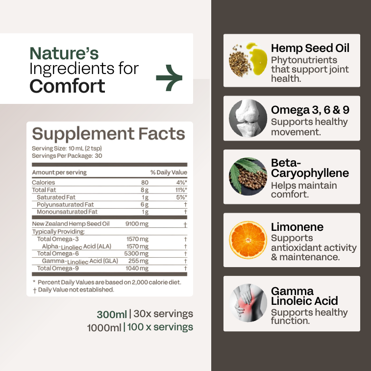 - How Active Hemp Seed Oil can support joint health and comfort, joint lubrication, flexibility and movement.